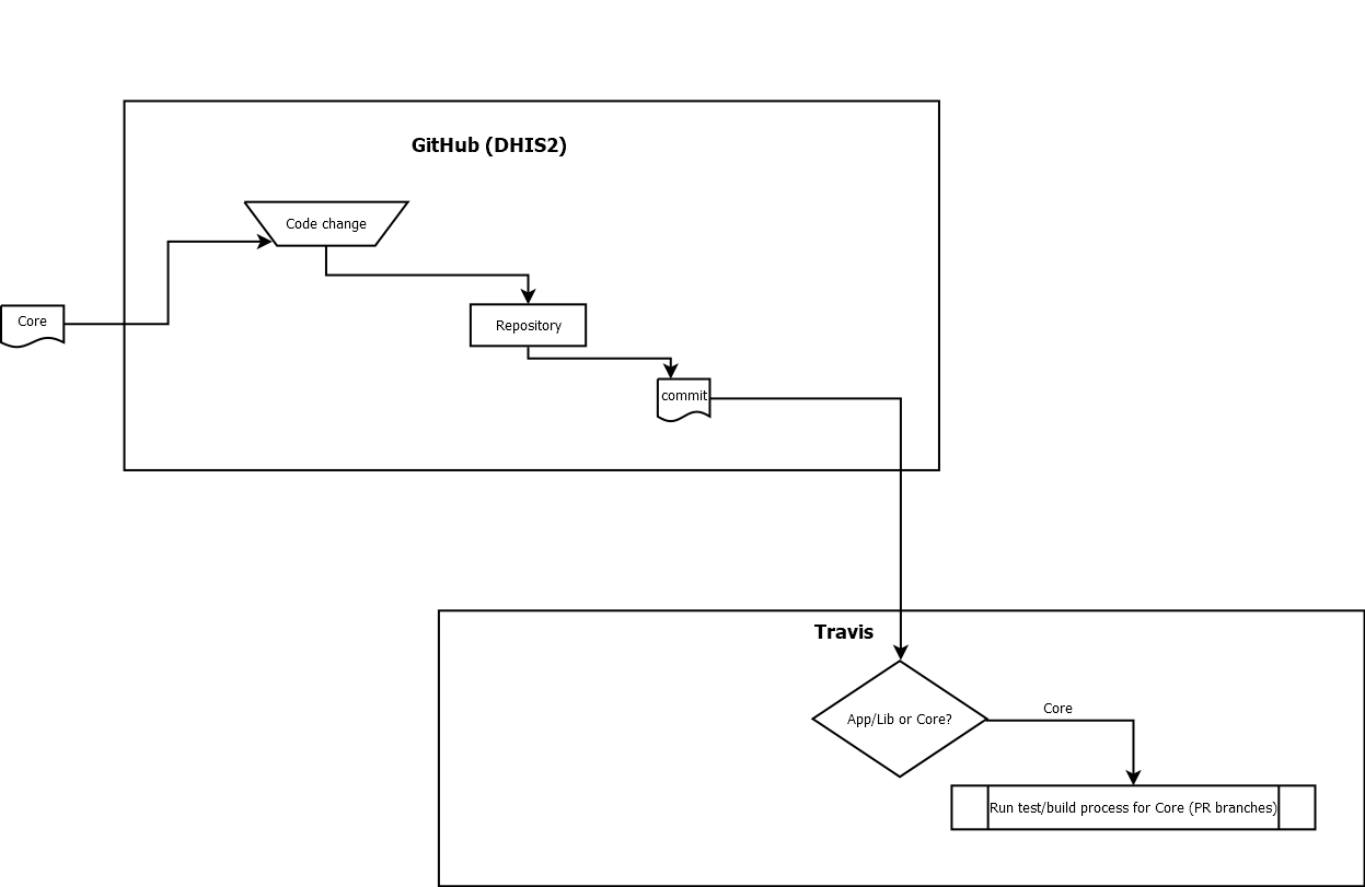 When the commit is pushed to the DHIS2 source repository on GitHub, the interaction between the GitHub and Travis services is triggered.