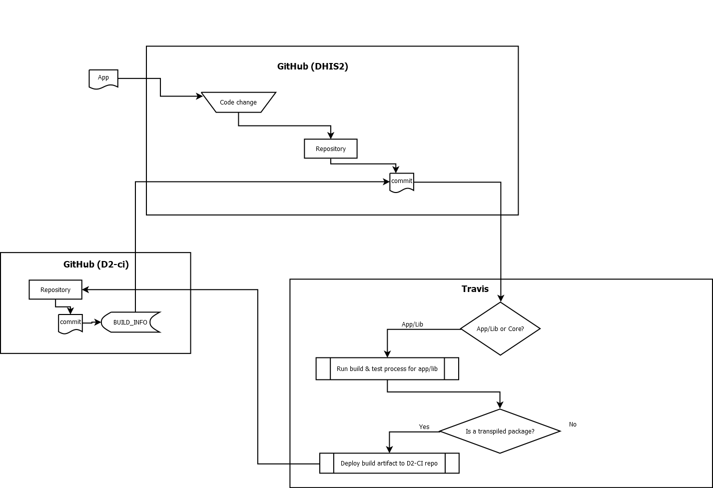 The d2-ci organisation is less conventional. Each front-end library or app in the dhis2 organisation that utilises the deploy-build scripts (more on this below) will have a corresponding repository under the d2-ci organisation. The corresponding d2-ci repository is automatically created if it doesn't already exist. Examples: