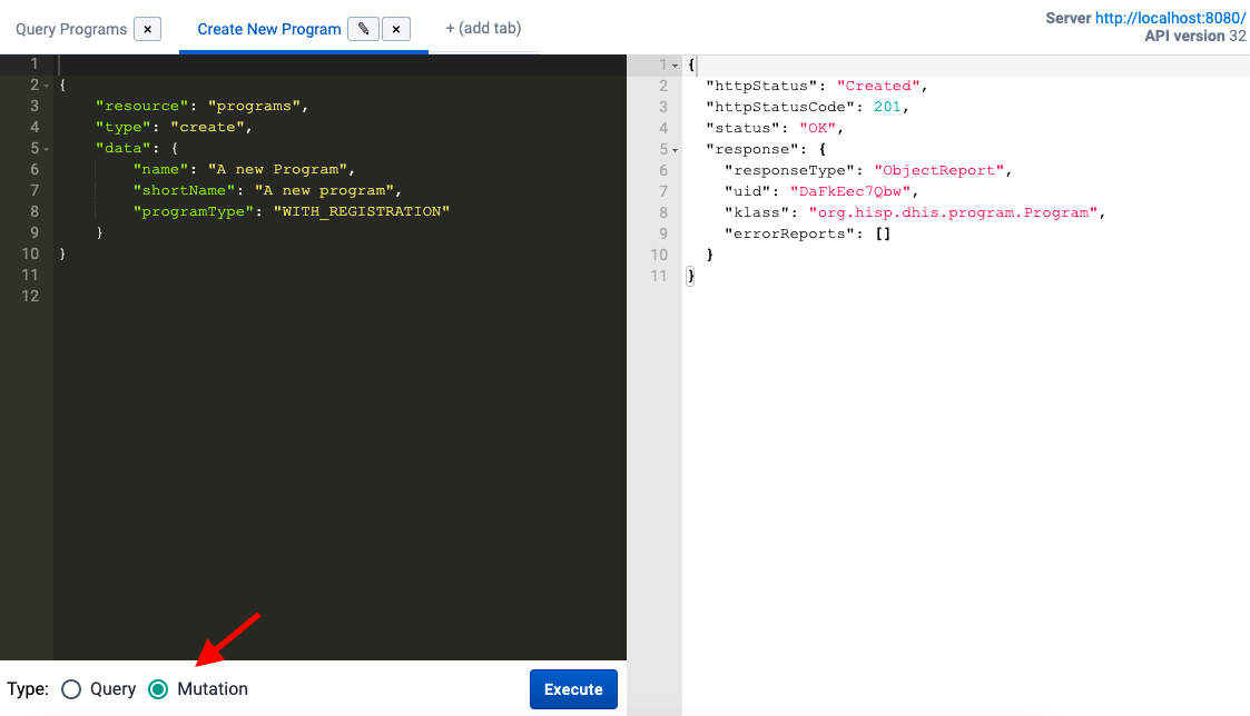 Before running this request, we select the Mutation option and click Execute. See the results on the left: