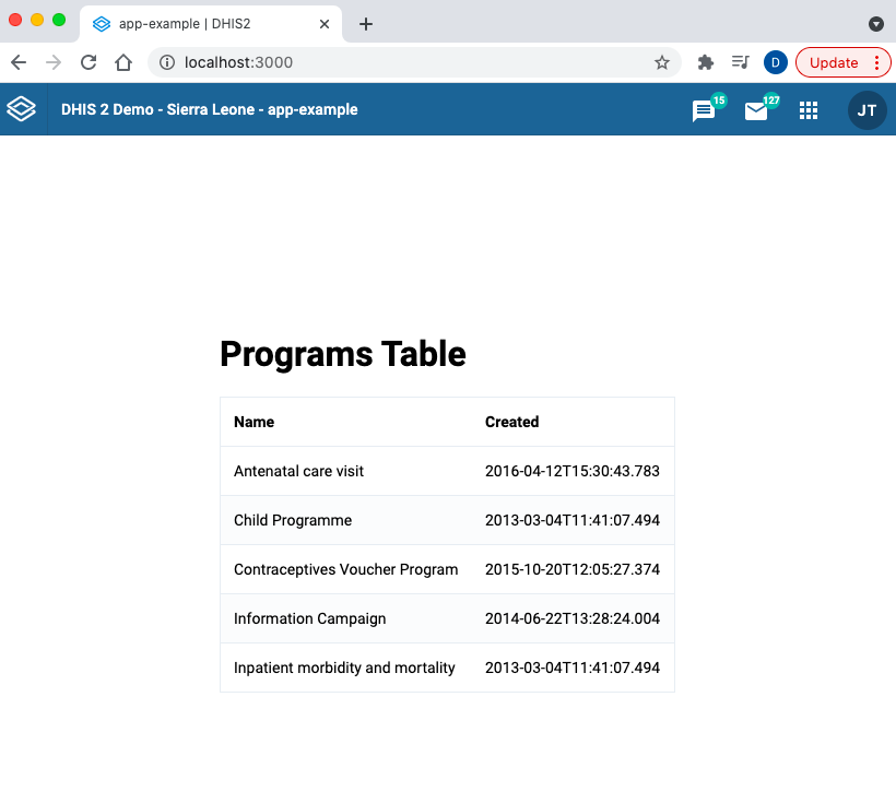 In this example, we are using the DHIS2 App Runtime to fetch and display the programs resource from the DHIS2 Web API (as you can see in the query object defined in the src/App.js file below).